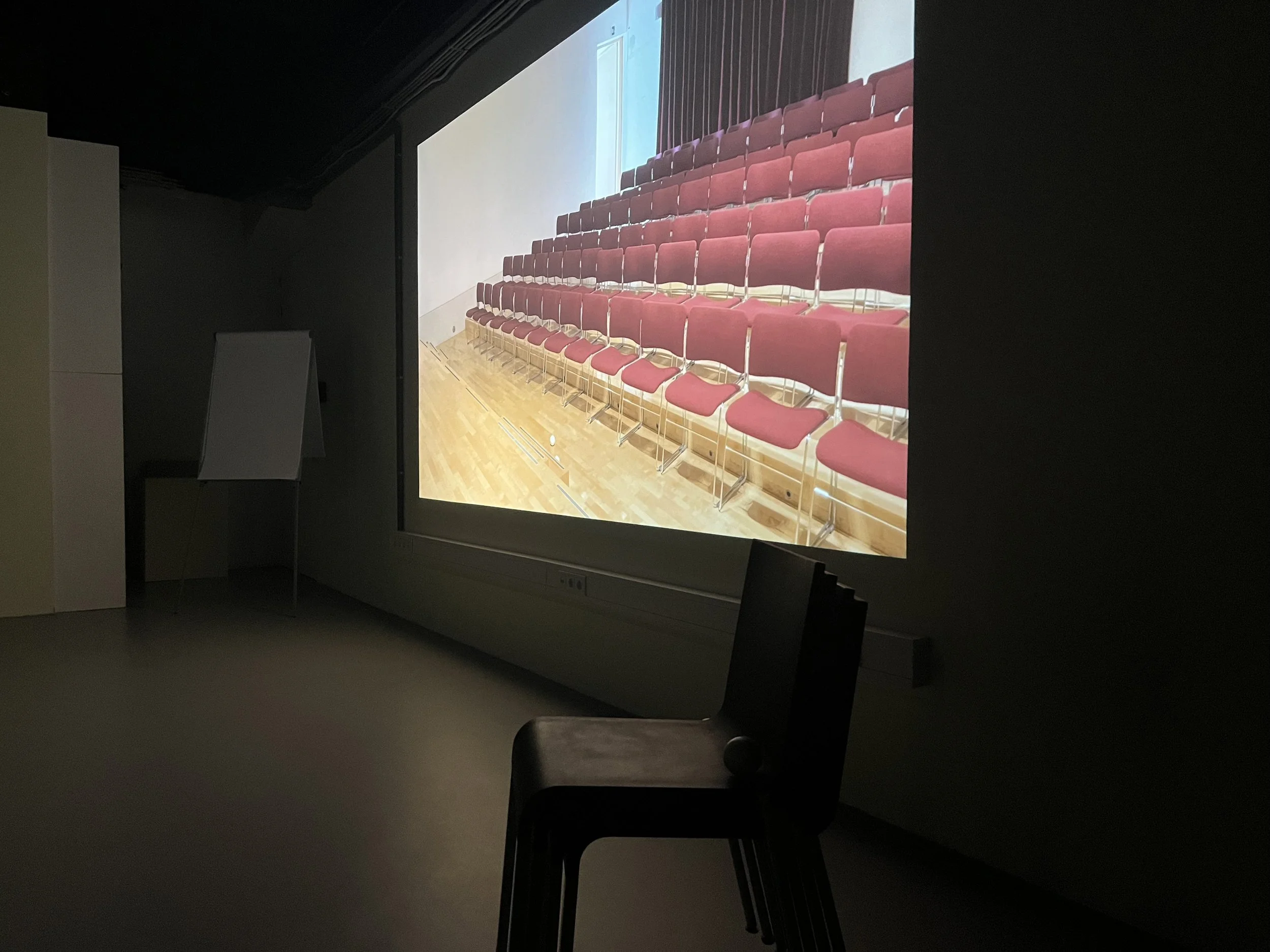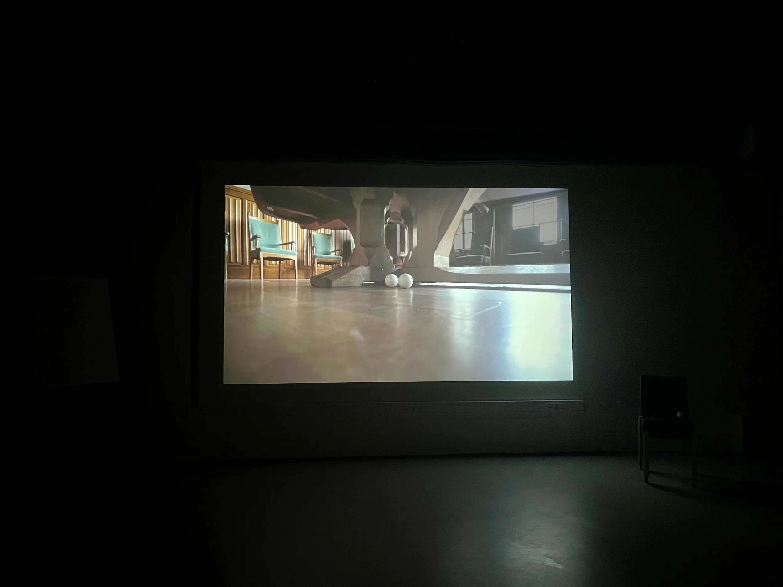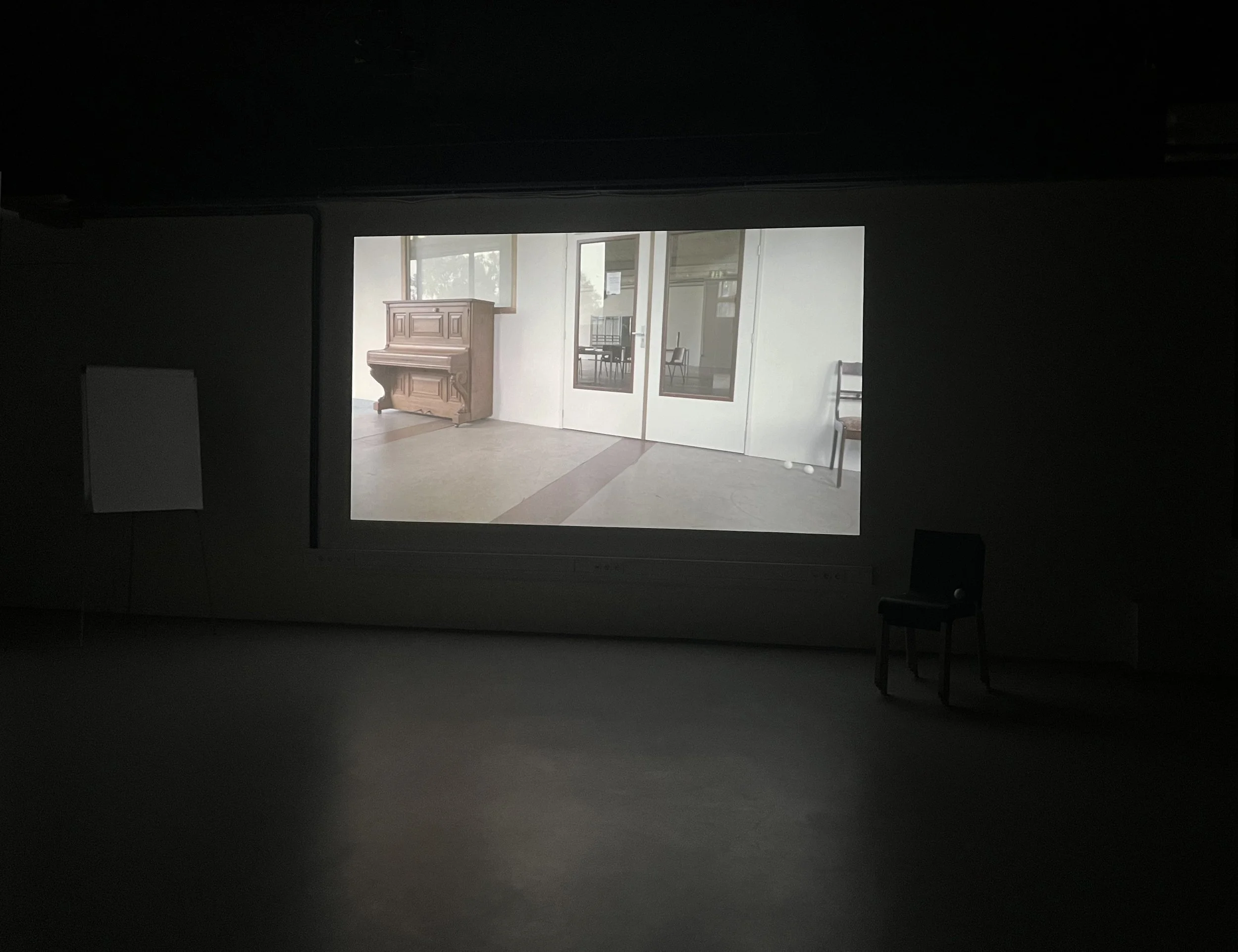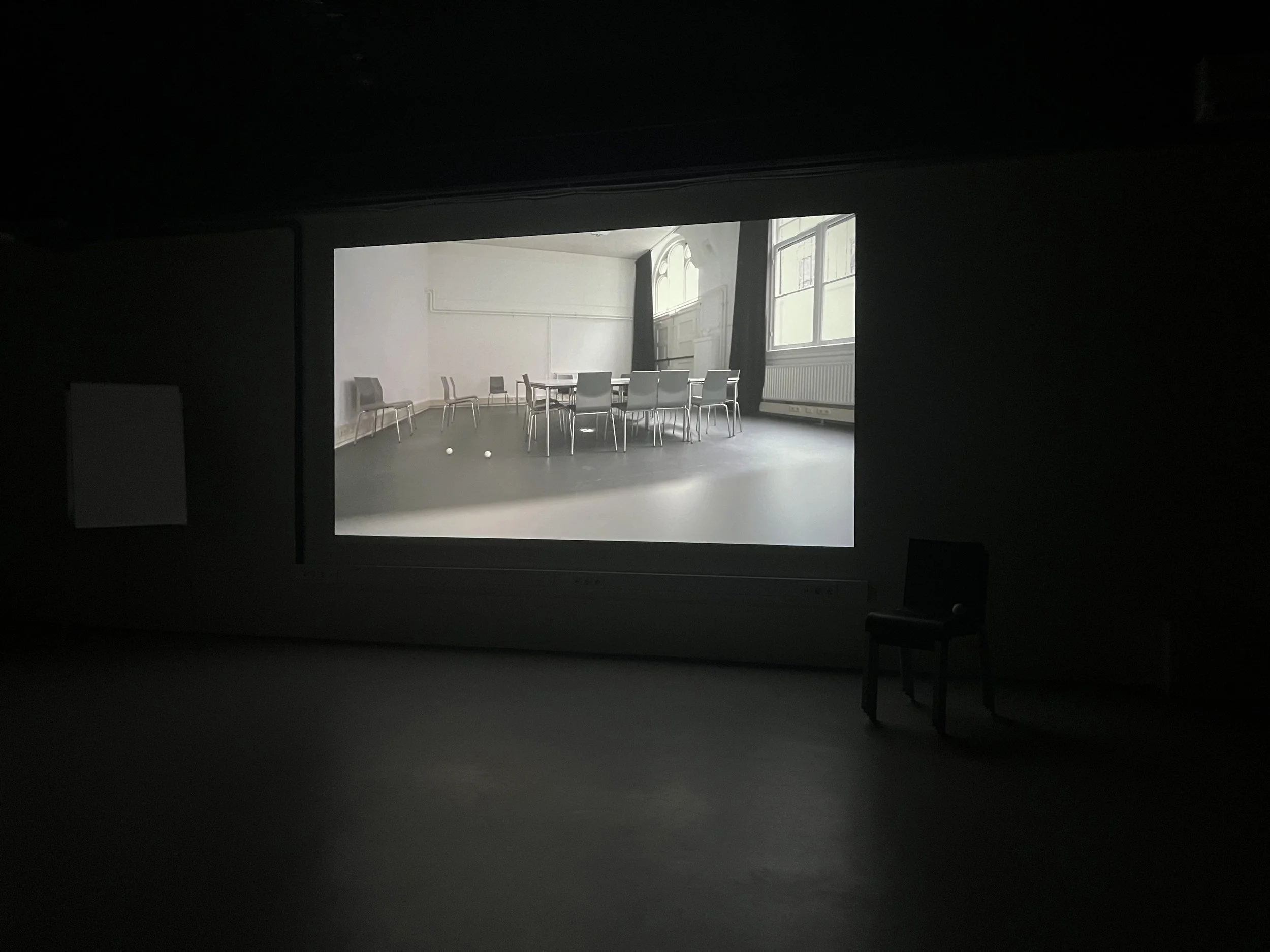 [documentation] A Scripted Atmosphere, 2025, G-Force Bouncy Balls, moving image, institutional sites, sets & props, at TENT Gallery, Rotterdam for the Piet Zwart Institute 2025 MFA Graduation Exhibition.