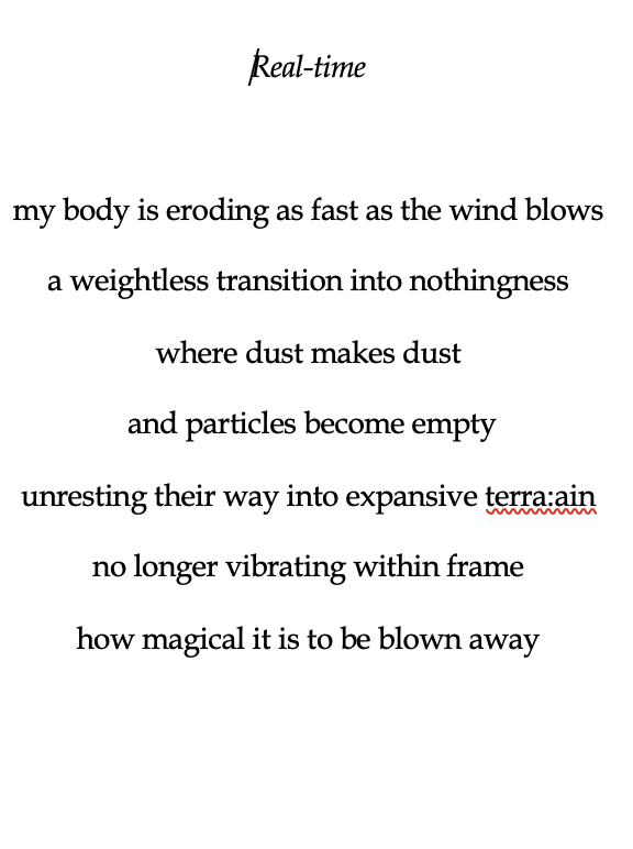 This research project encompasses past, present and future works, as it has become apparent that working through context is preferential for me, allowing my own bodily movement (walking, breathing, dancing, laughing, crying, speaking, resting) to remain in active conversation with the geographical bodies I am supported by.